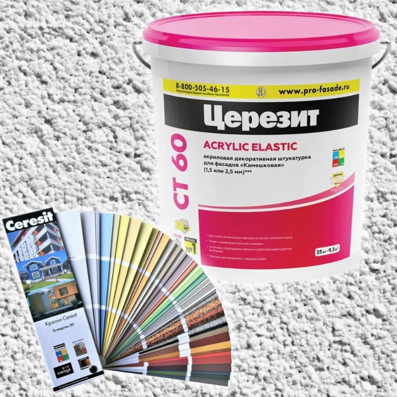 Штукатурка CT 60 Visage предназначена для изготовления тонкослойных декоративных покрытий на таких основаниях как бетон, цементные и гипсовые штукатурки, гипсокартон, древесностружечные плиты и т.п., а также на базовом штукатурном слое в составе систем фасадных теплоизоляционных композиционных (СФТК) с теплоизоляционным слоем из пенополистирольных плит (Ceresit EPS). Ceresit CT 60 (Церезит СТ 60) - декоративная акриловая штукатурка "камешковая" (фракции 1,5 и 2,5 мм), предназначена для создания декоративных покрытий с зернистой фактурой.