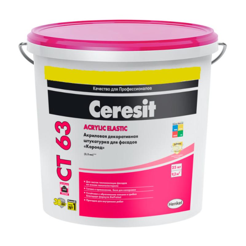 Штукатурка Ceresit CT 63 отличается повышенной влагостойкостью, сохраняет прочность в помещениях с повышенной влажностью. Хорошо подходит для устройства декоративных покрытий в районах с переменчивыми погодными условиями, а также в местах с повышенным движением (лестницы, коридоры). Можно использовать как внутри, так и снаружи зданий. В том числе используют в системах наружной теплоизоляции декоративного штукатурного фасада с пенополистиролом в качестве утеплителя.